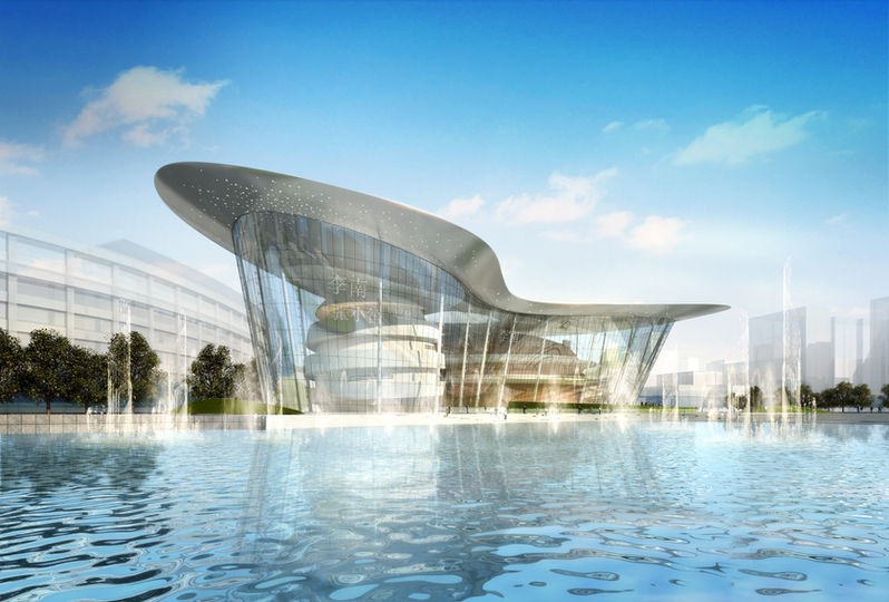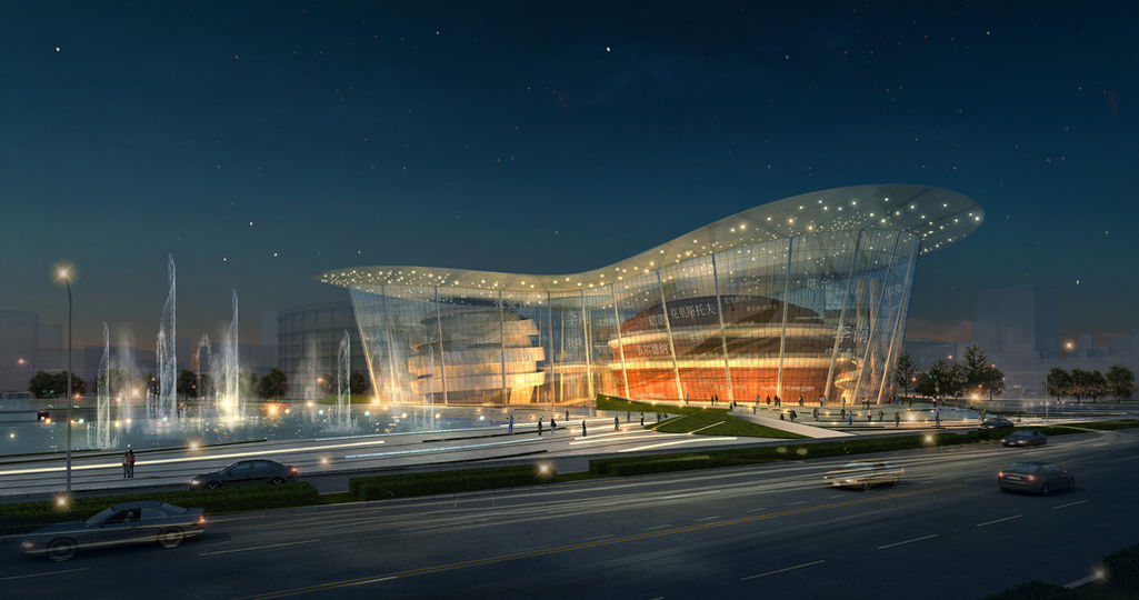 The building's external curved transparent glass wall welcomes visitors into the main hall while enjoying the magnificent views of the city, the lake and the modern landscape design proposed.